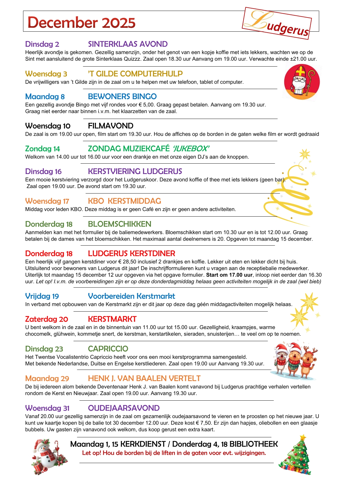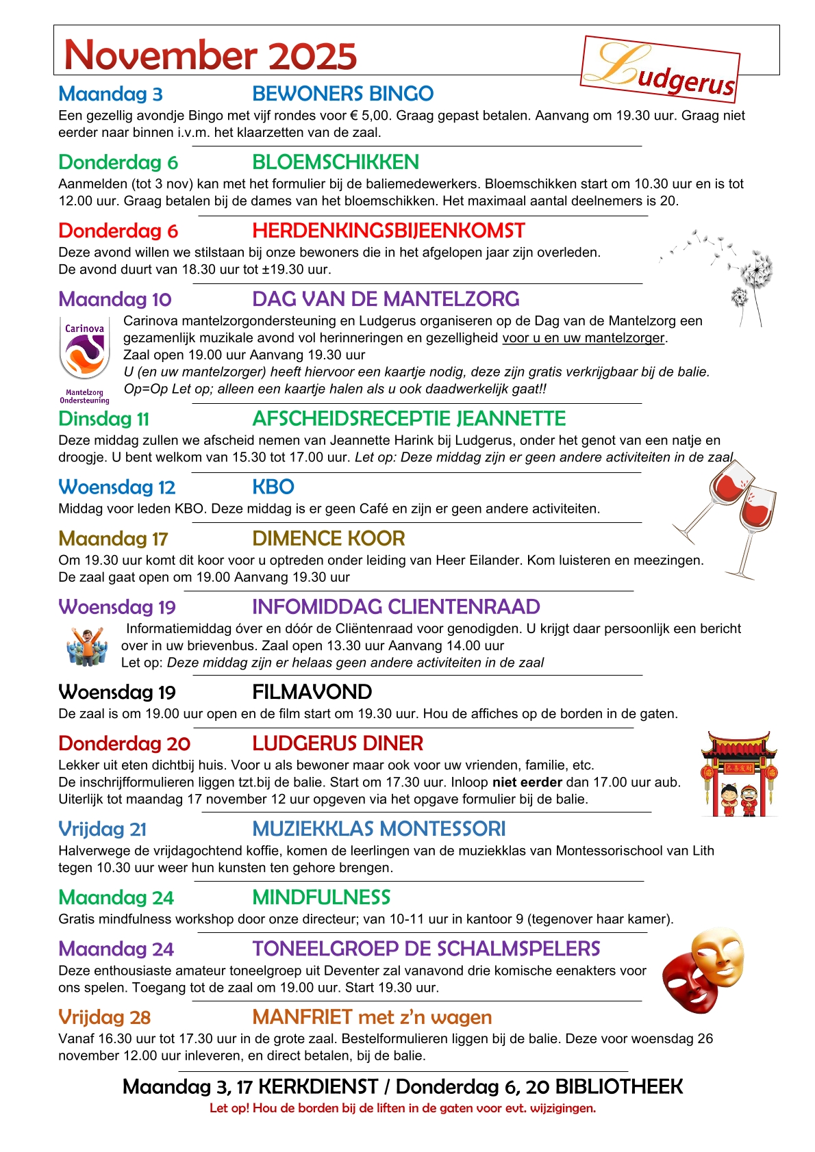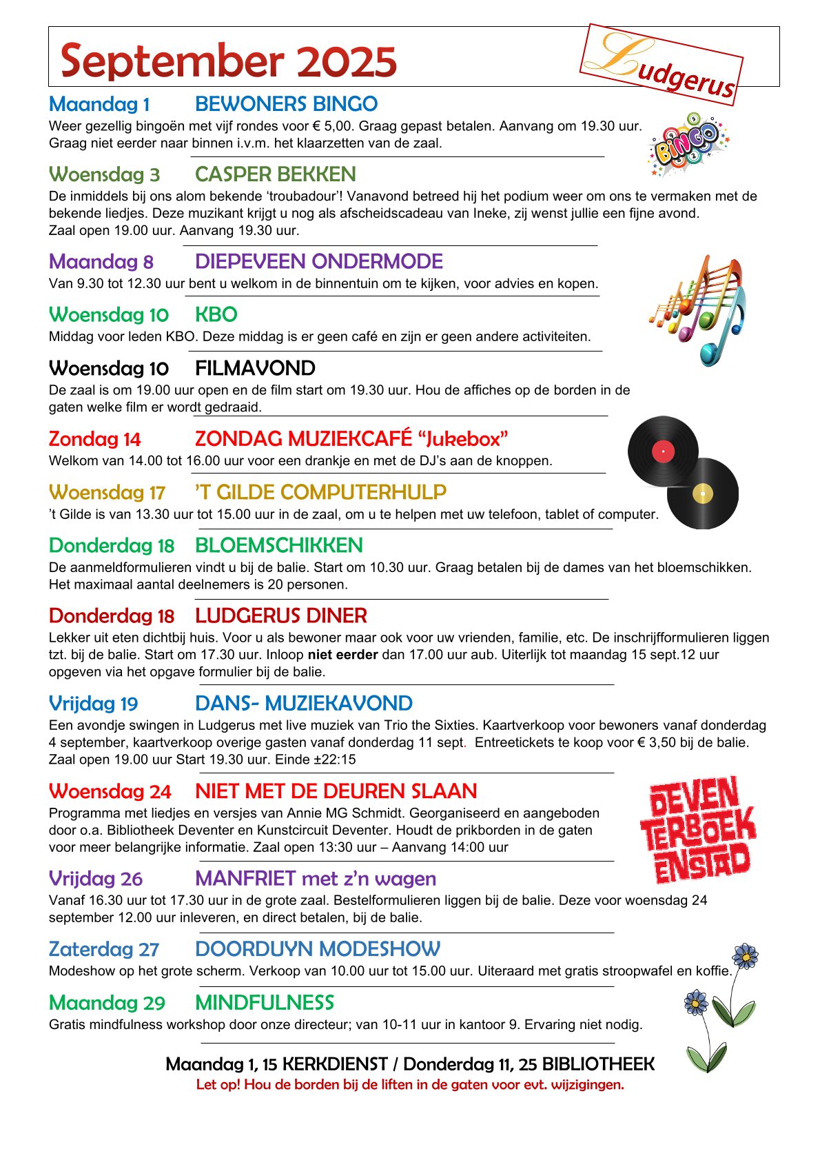 Het huidige maandprogramma is te vinden op de infoborden binnen Ludgerus en in de liften. Elke maand ontvangen de bewoners deze ook in de brievenbus. Hieronder treft u enkele recente 'voorbeelden'
